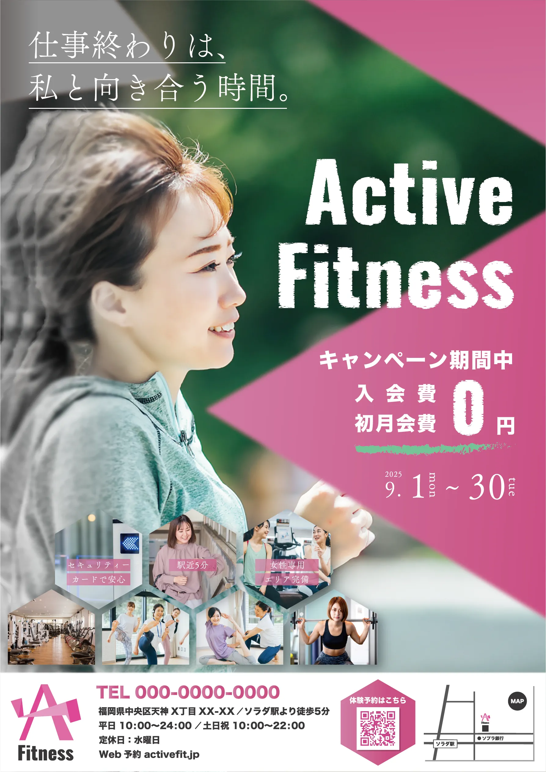 安心感と女性らしい上品さを重視したジム入会キャンペーンチラシ。 余白を活かし視線の導線を工夫することで、未来やポジティブなイメージを喚起。