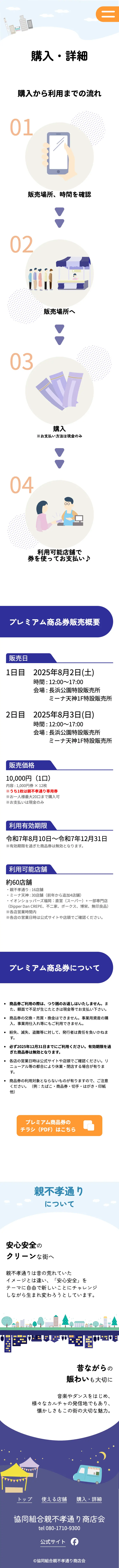 親不孝通りの魅力を訴求し、1日を通して商品券を利用する楽しさを表現したチーム制作サイト。5人で分担し、私はデザイン・コーディング・JS実装を担当しました。