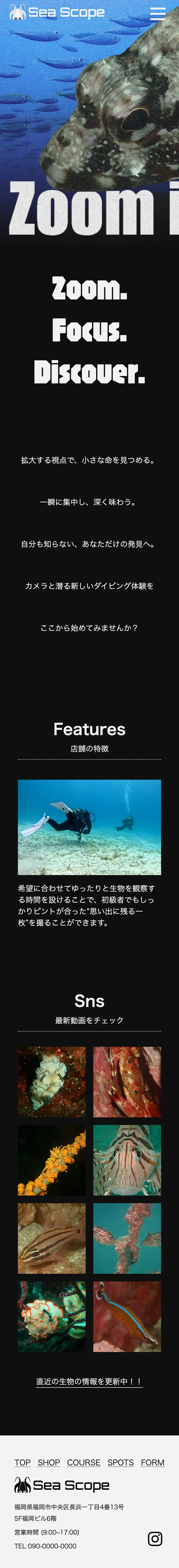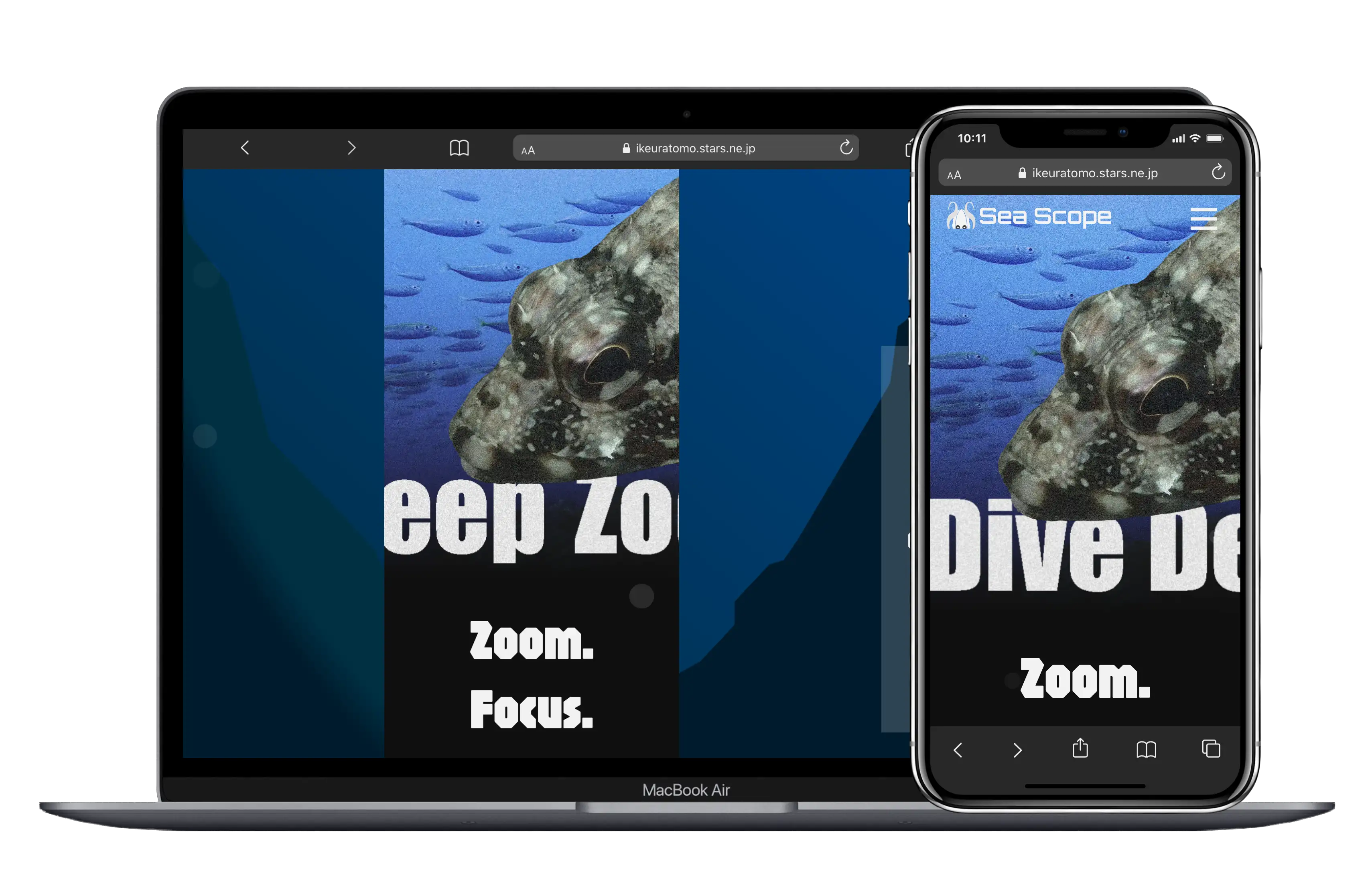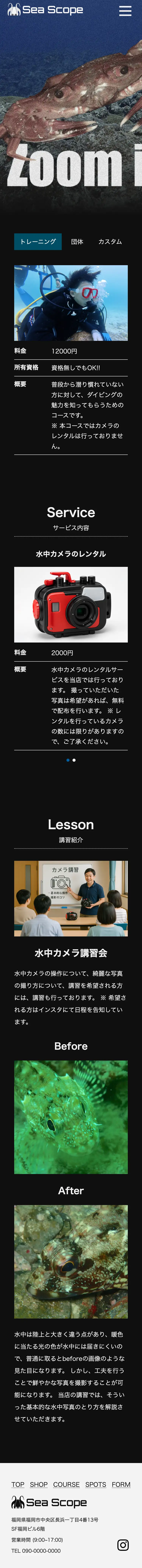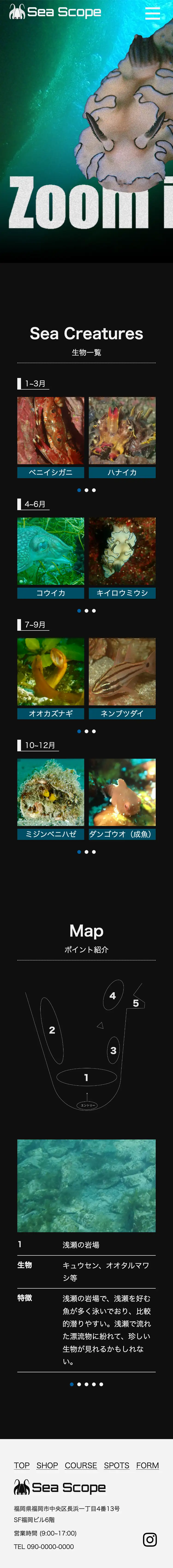 | point | 暗めの色を基調に水中の神秘的な雰囲気を演出し、キャッチコピーはスライド表示でスマホ対応、泡のJSやCSSアニメーションで水中体験を再現 |