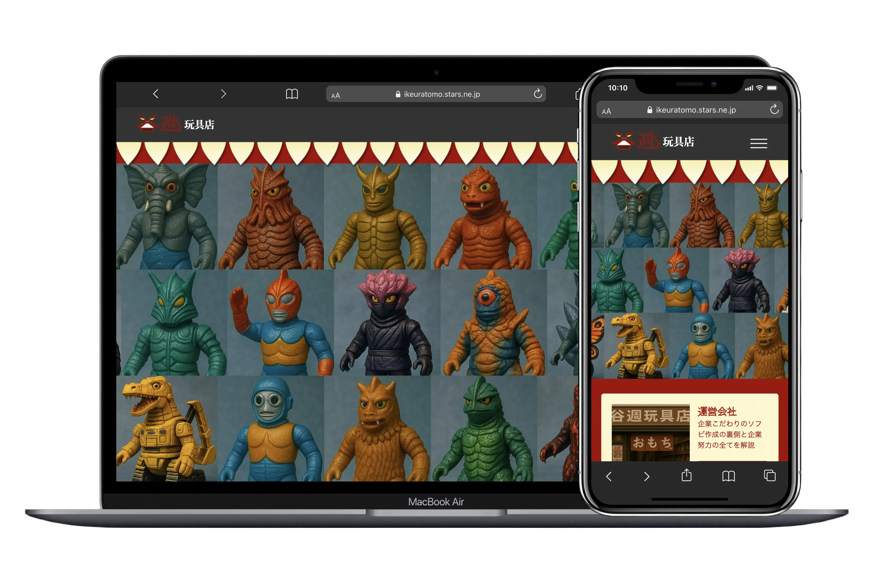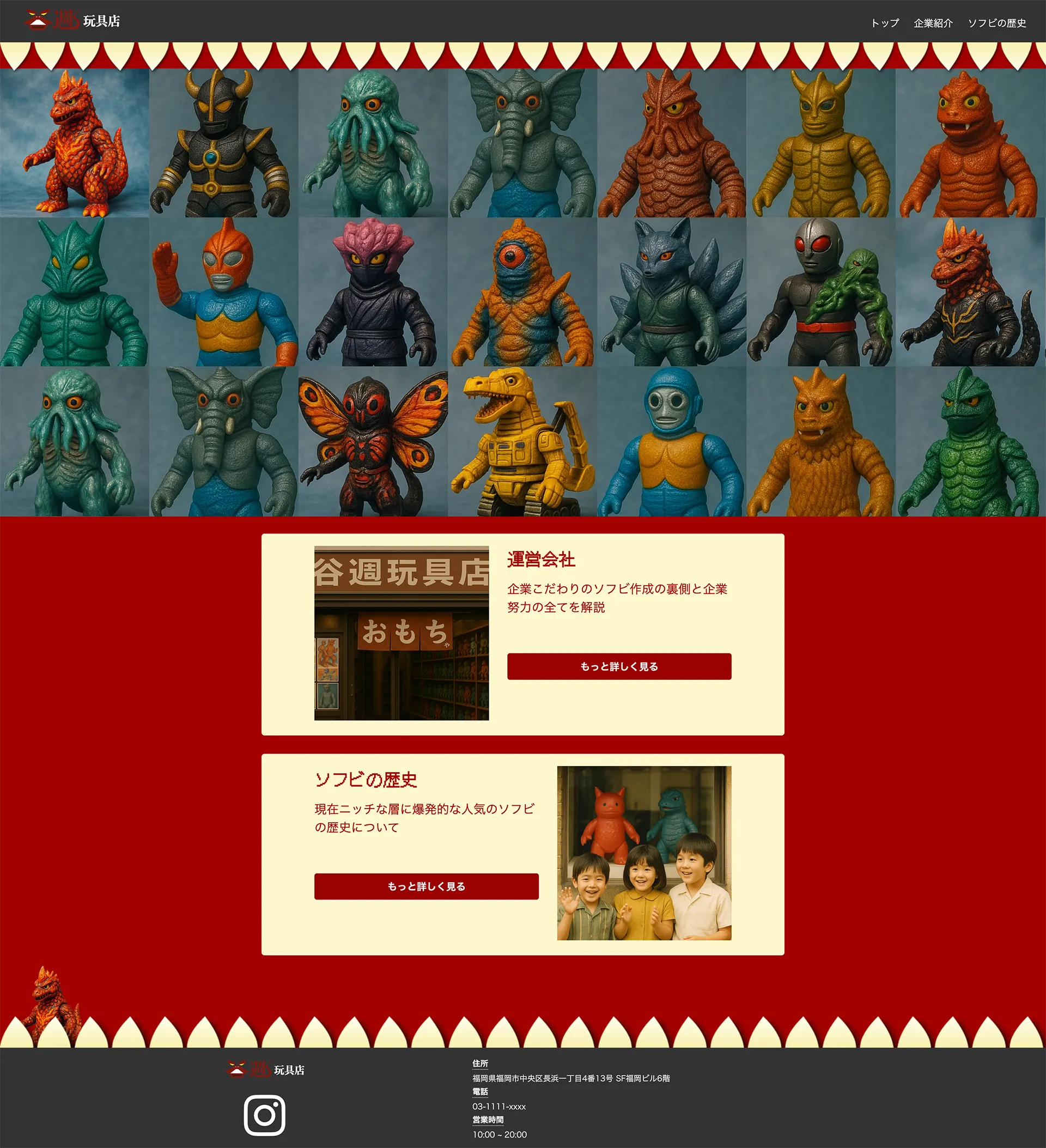 職業訓練校の課題として制作した、男性向けにレトロ感を演出したソフビ専門店の紹介サイト。 トップページで多くの商品が見られる構成で、迫力と世界観を両立。